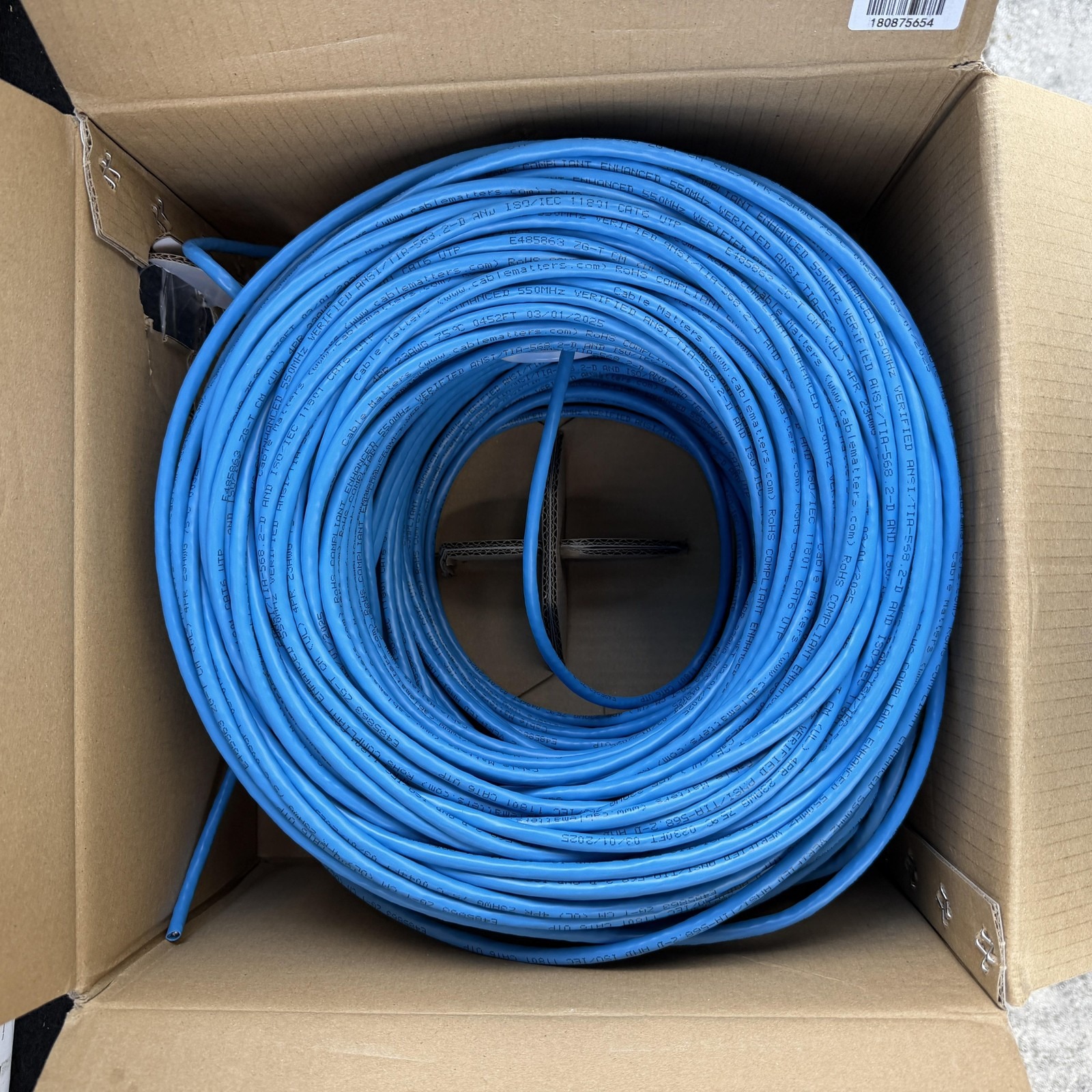 Label text: "500 ft Cat 6 550MHz UTP Solid, CM, 4PR 23AWG 75°C Bulk Cable, Blue"