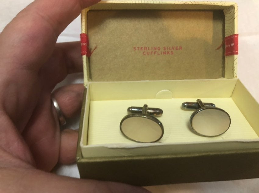New in box Mother of Pearl Sterling Silver Cuff Links. 2005 Target. They will require polishing if desired. They are stamped 925 on the back. Please see pictures for expanded description, condition and measurements.