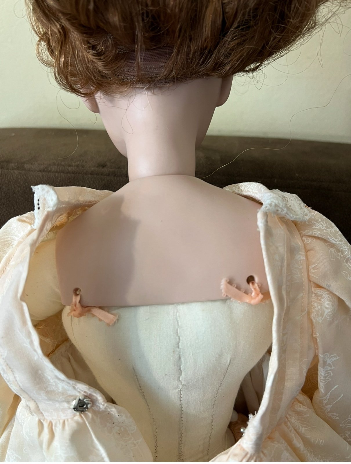 The Vintage Porcelain Doll "Kate" by Jennifer Esteban is a 25-inch doll from 1995. This handmade doll features curly light brown hair and hazel eyes. With a soft body and removable clothes, this licensed reproduction of a girl doll is ideal for collectors or anyone looking for a unique addition to their doll collection. The doll comes with a hat and is a single unit, perfect for all occasions. Made of porcelain and fabric, this Caucasian doll with a light complexion and delicate features captures the essence of a child from the 1990s.