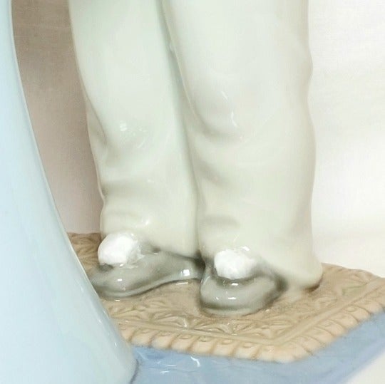 This is an incredible Lladro Daisa "Clean Up Time" vintage sculpture figurine. It was first introduced in 1973 and retired in 1993. Item number is 4838. It's from the Children's collection. This piece is about a young girl washing before going to bed. Her face is so adorable. She's looking to the side. The little girl has her brown hair in pigtails. She is wearing pajamas and holding the pants up because they're too big on her. The little girl's backside is showing. She is also wearing cute little grey slippers. There is a blue sink where she's cleaning up. It finished in Lladro unique pastel colors. It is a hand painted figurine that is a wonderfully sculpted and is stunning. It was hand made with a glazed finish. It was hand made in Spain. It measures 7 1/4" tall 4" wide. This piece is in excellent condition no chips or cracks. No original box. Last known original retail price is $335.00.