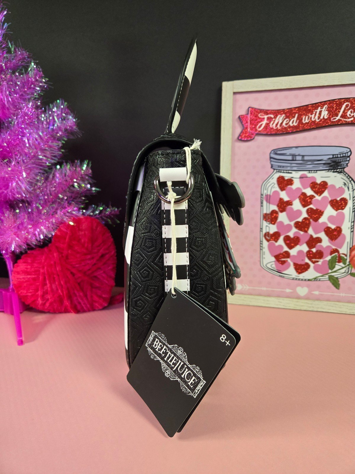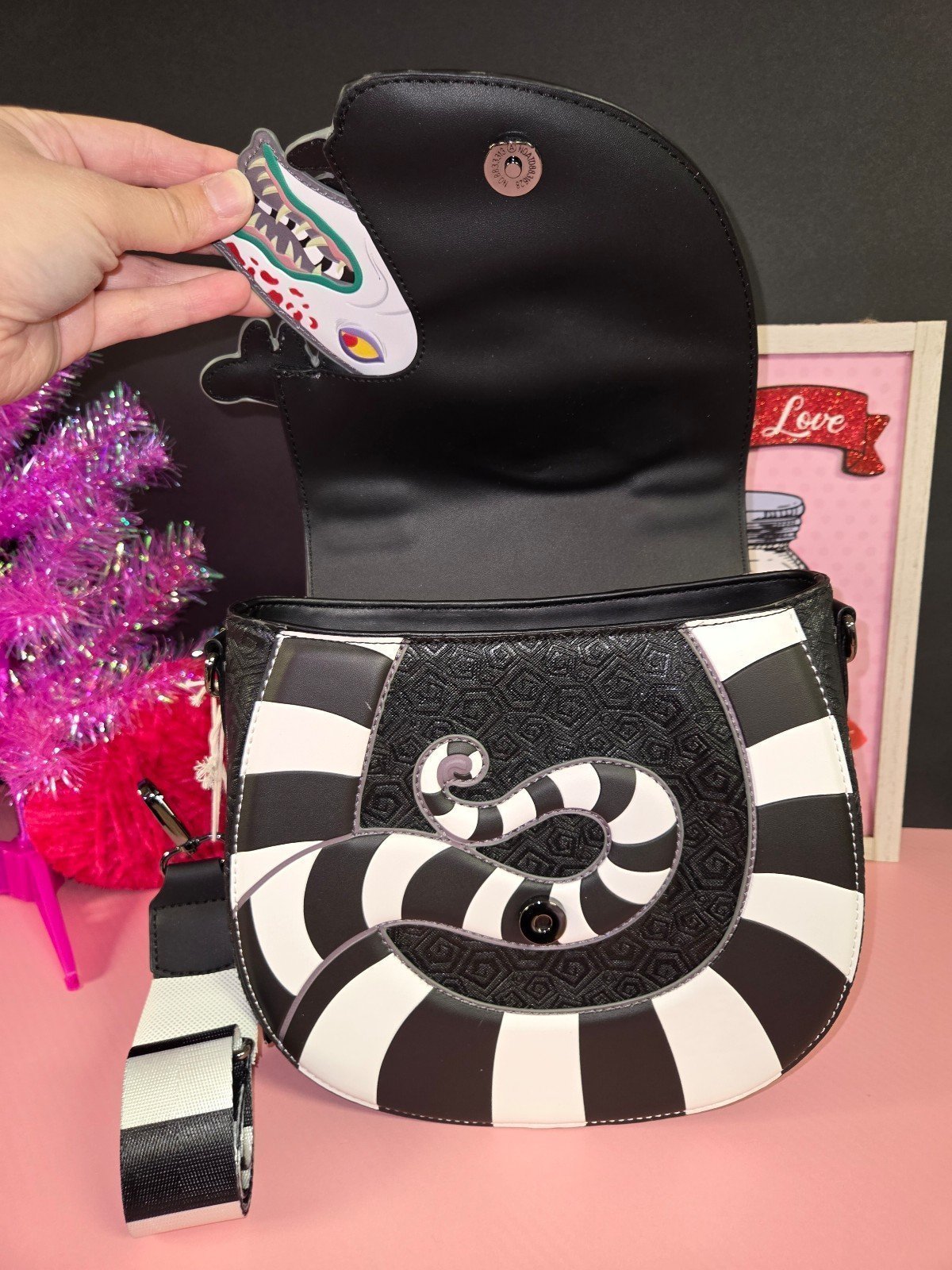Coiled like a sandworm from the movie, this creature comes to life in applique detail, with sumptuous black-and-white stripes. The menacing mouth opens, and you can see the head of another Sandworm inside. You can even pull that head out partway, but it snaps right back for an extra bite of fun. The full head of the Sandworm forms the front flap of the bag, and inside, you can find just enough room to pack what you need for a day trip. On the back, the Sandworm’s coil appears to drape down—and Beetlejuice peeks out. Make a hauntingly delightful impression wherever you go.